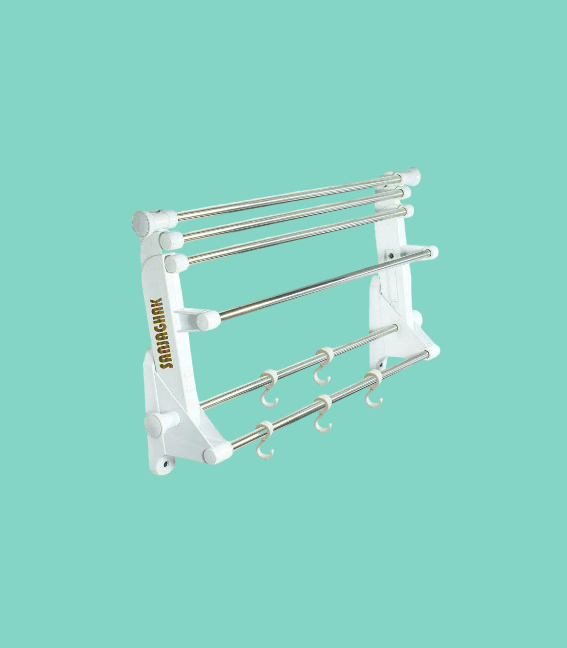 - بند رخت دیواری تاشو از استیل ضد زنگ 304 تولید شده است و قابل نصب روی دیوار و در فضاهای محدود همچون حمام و بالکن می باشد.